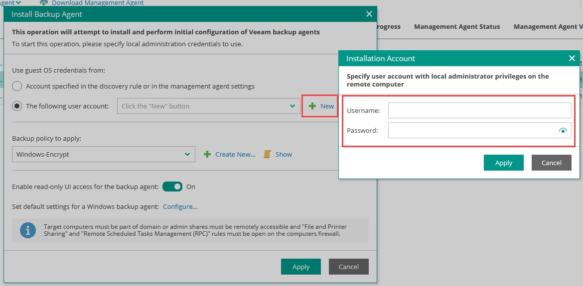 Tài khoản này phải có quyền quản trị trên các máy tính nơi bạn muốn cài đặt Veeam backup agents.