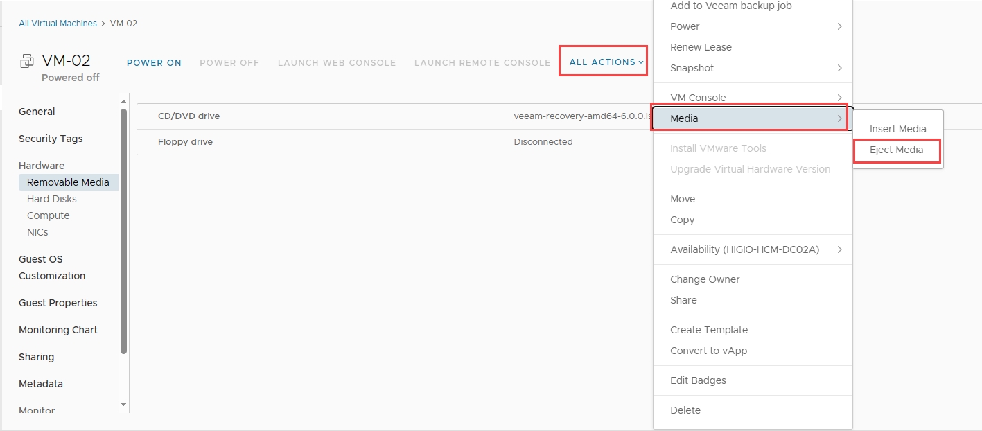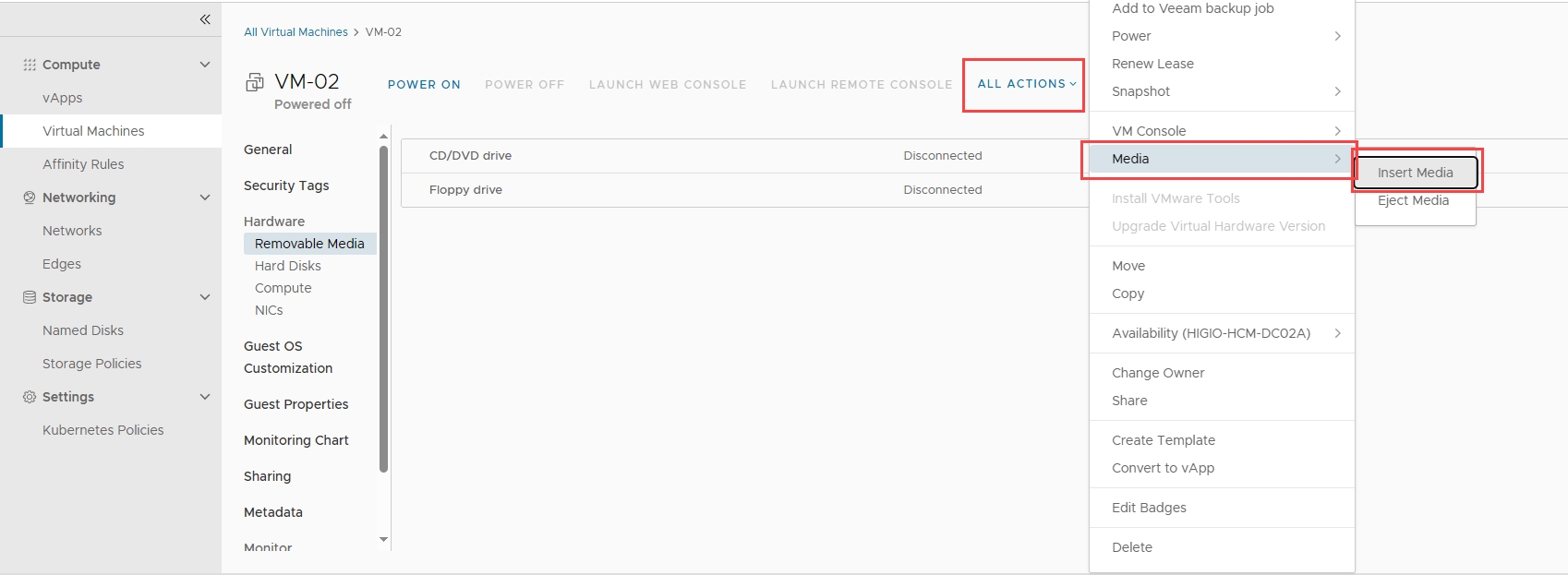 Từ VM, chọn ALL ACTION > Media > Insert Media