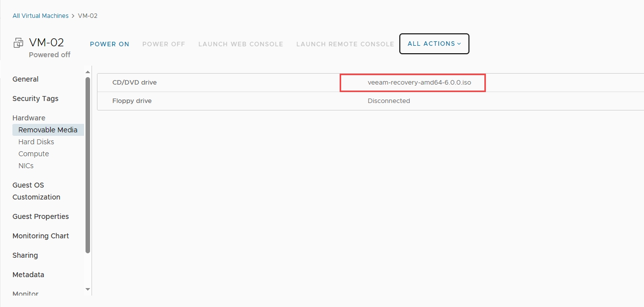 Bước 1: Gắn Veeam Recovery Media vào VM