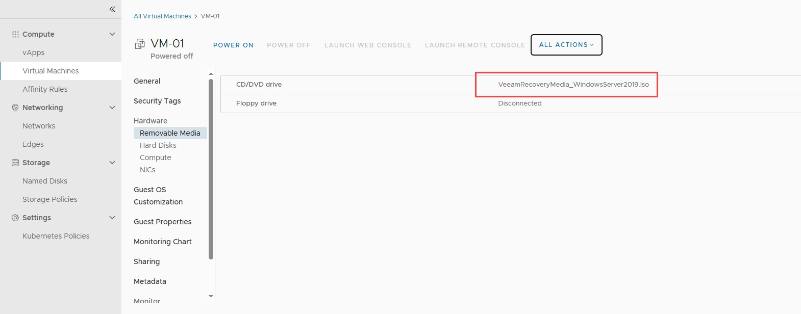 Bước 1: Gắn Veeam Recovery Media vào VM