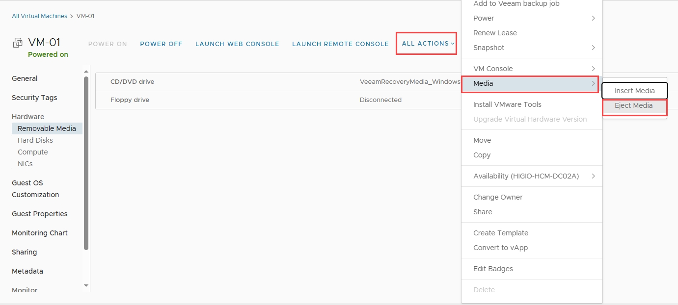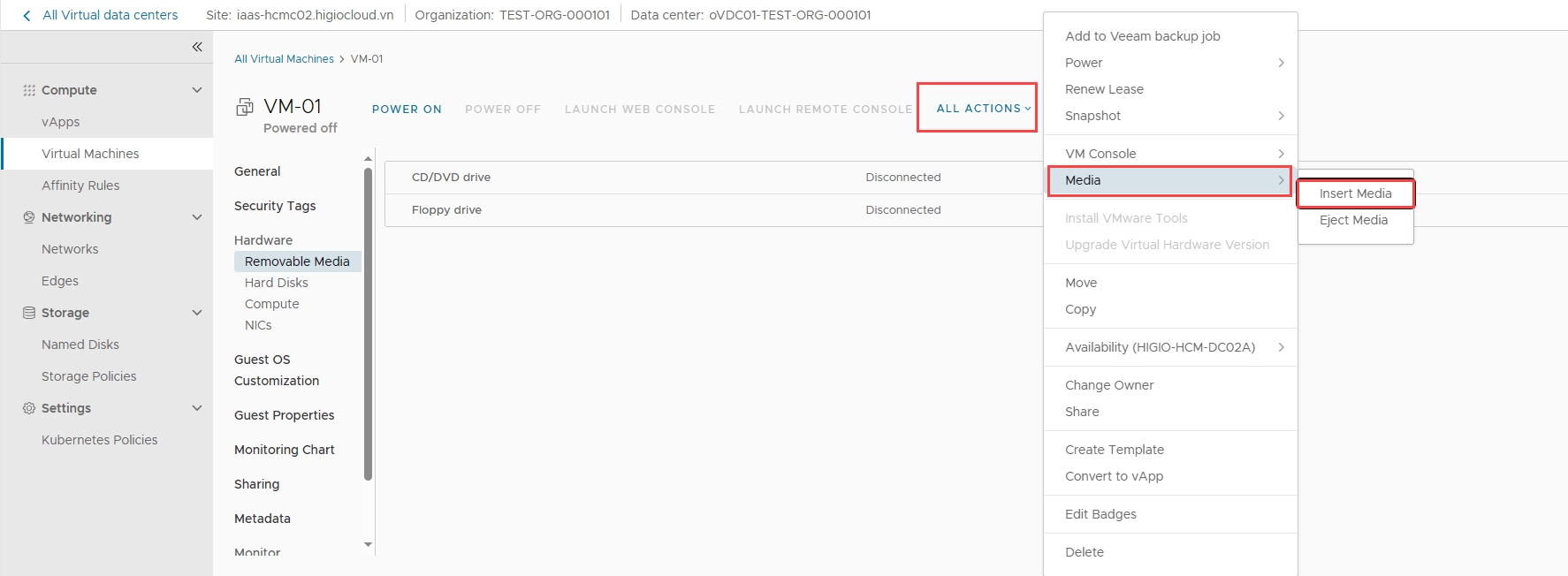 Từ VM, chọn ALL ACTION > Media > Insert Media