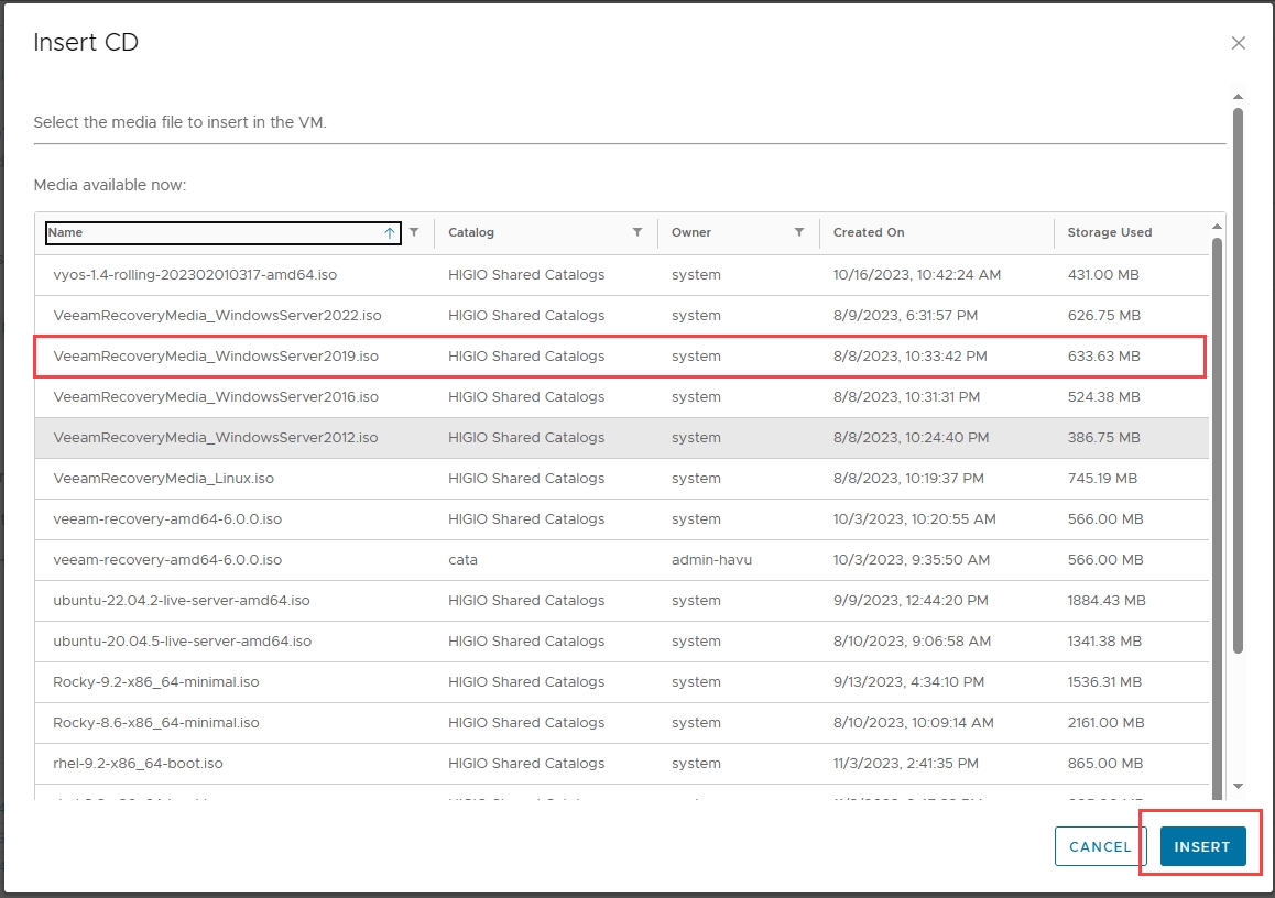 Chọn Veeam Recovery Media (tương ứng với hệ điều hành của bạn) → Insert.