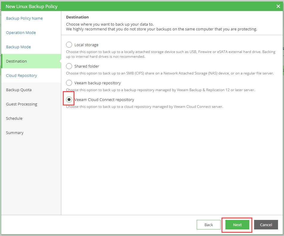 Chọn Veeam Cloud Connect repository, sau đó nhấn Next