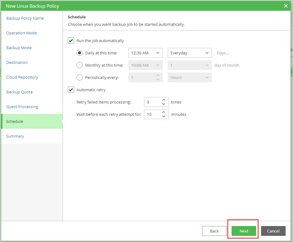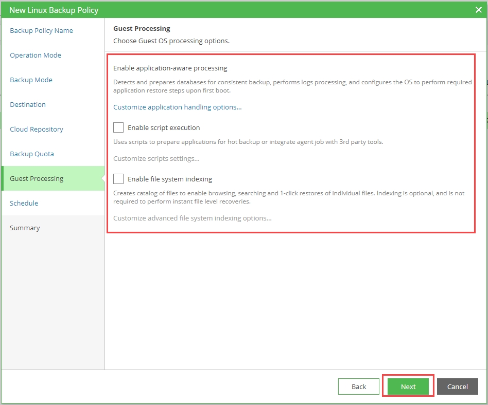 Kích hoạt application-aware processing hoặc script execution hoặc file system indexing nếu bạn muốn ack up. Nhấn Next.