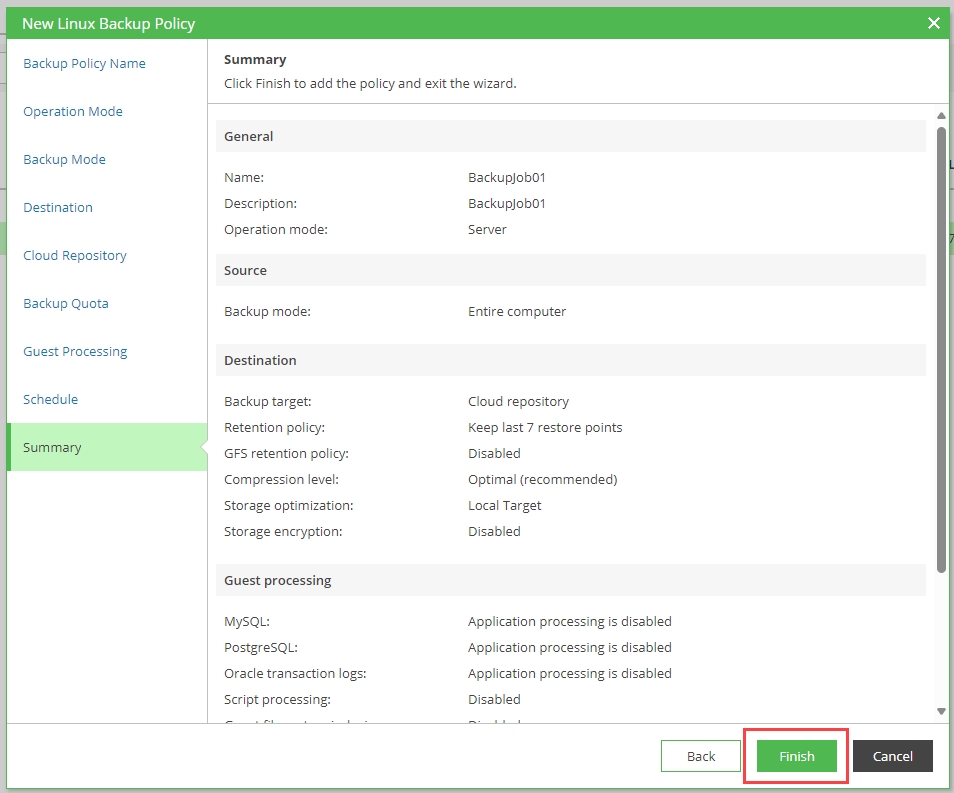 Xem lại cấu hình backup job, sau đó chọn Finish.