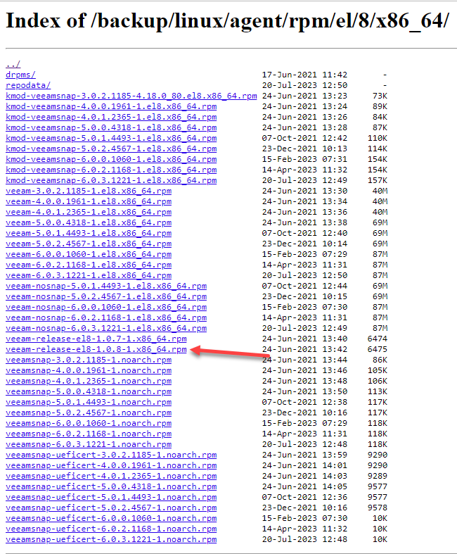 Veeam repository cho Linux có thể tìm thấy tại Index of /backup/linux/agent/rpm/el/8/x86_64/ . Trên trang này, chọn "veeam-release-el8-1.0.8-1.x86_64.rpm".