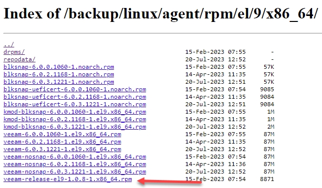 epository Veeam cho Linux có thể được tìm thấy tại Index of /backup/linux/agent/rpm/el/9/x86_64/ . Trên trang này, chọn "veeam-release-el9-1.0.8-1.x86_64.rpm".