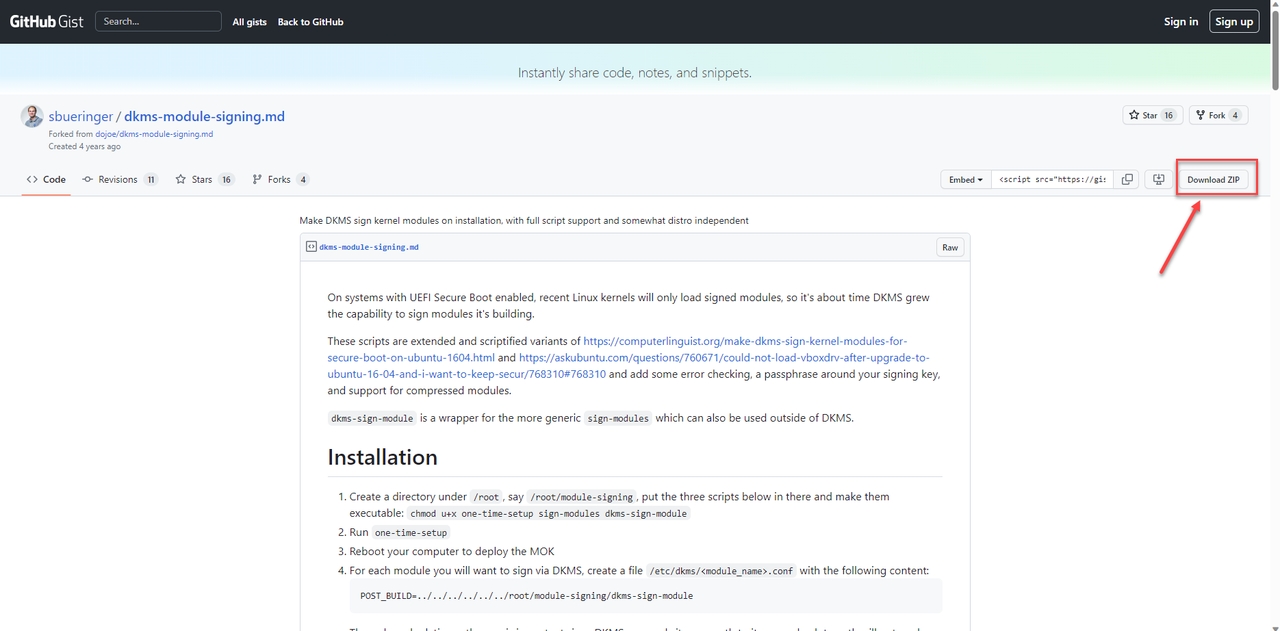 # mkdir module-signing/Tải 3 script từ liên kết: Make DKMS sign kernel modules on installation, with full script support and somewhat distro independent và đặt chúng vào thư mục vừa tạo: