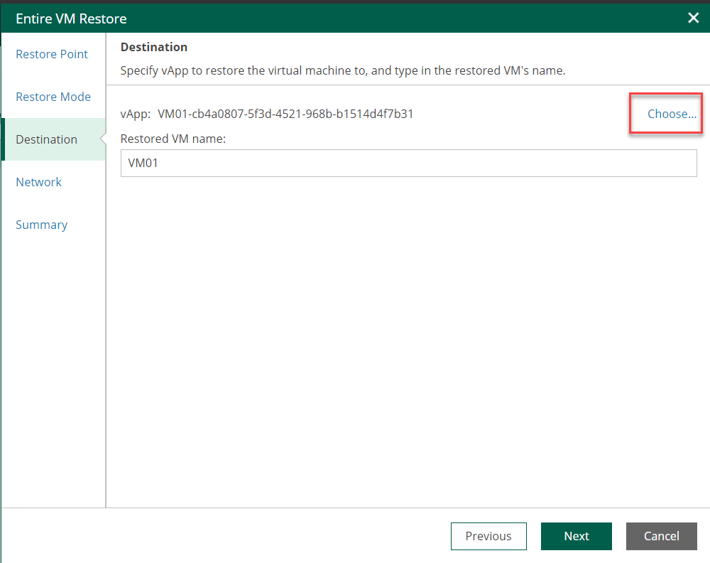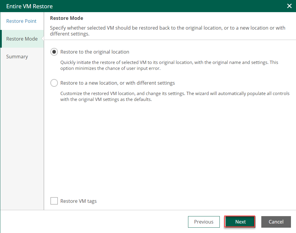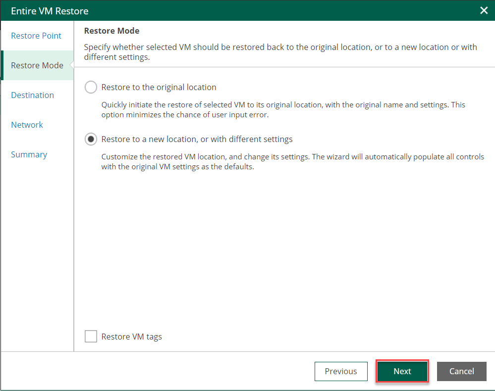 Mode 02 - Restore to a new location or with different settings: Tùy chỉnh vị trí khôi phục và thay đổi cấu hình VM. Trình hướng dẫn sẽ tự động sử dụng cấu hình gốc của VM làm mặc định.