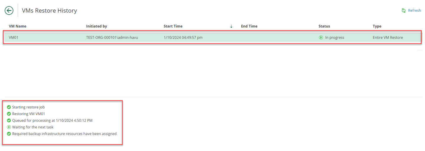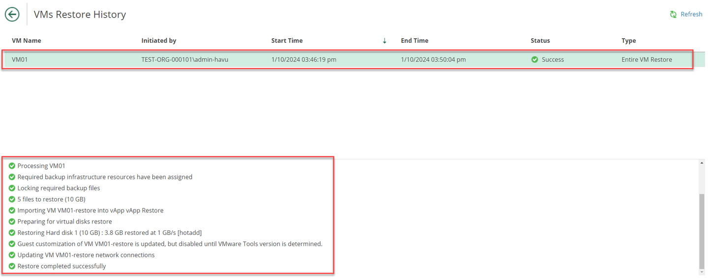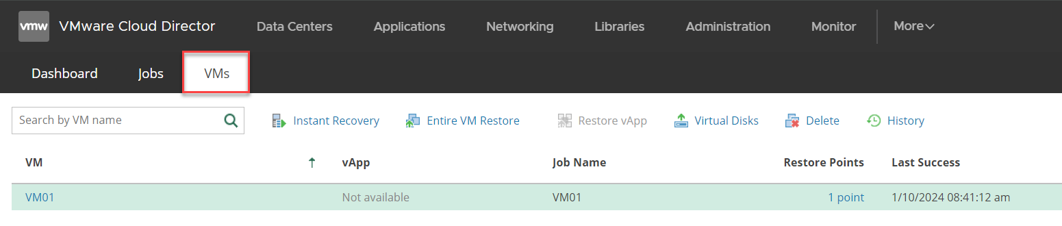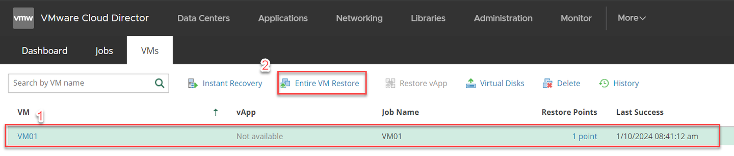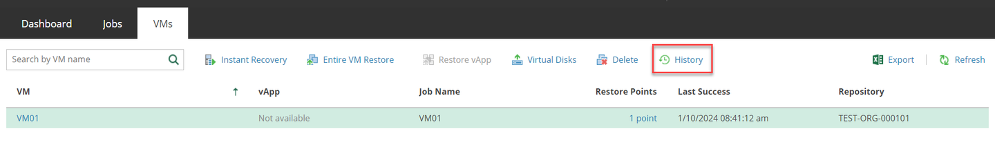Chuyển đến tab VMs → History để kiểm tra trạng thái khôi phục VM.