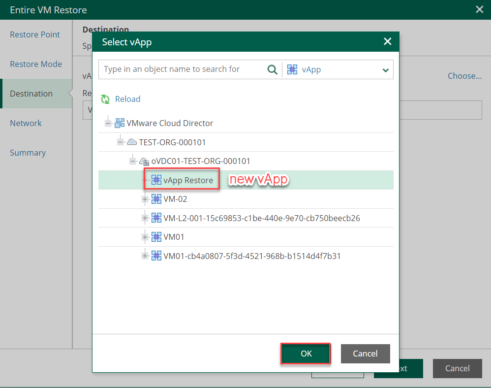 *** Chỉ định vApp để khôi phục VM và nhập tên mới cho VM khôi phục.