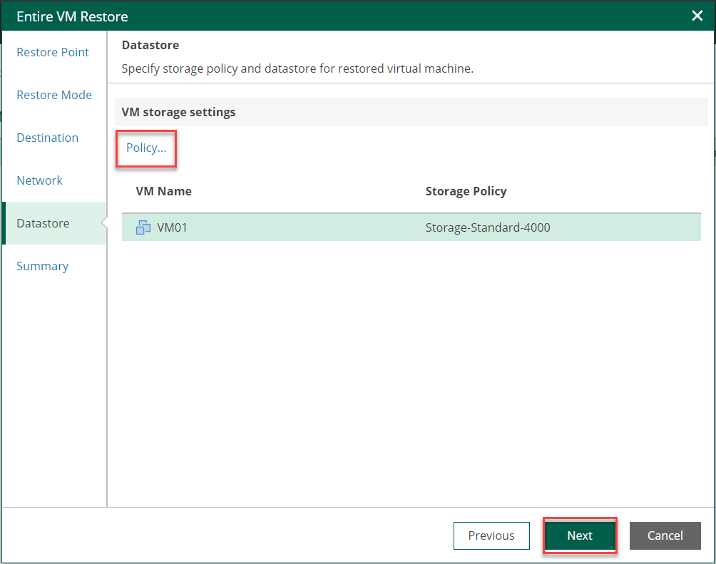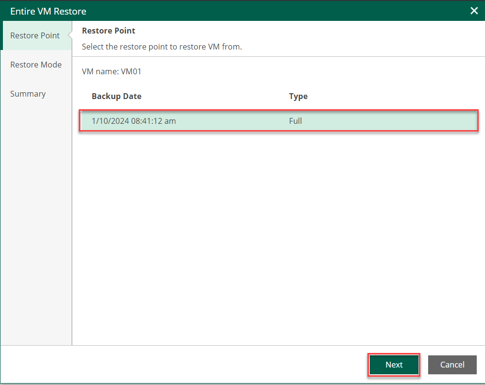 Chọn VM và restore point cần thực hiện Entire Recovery.