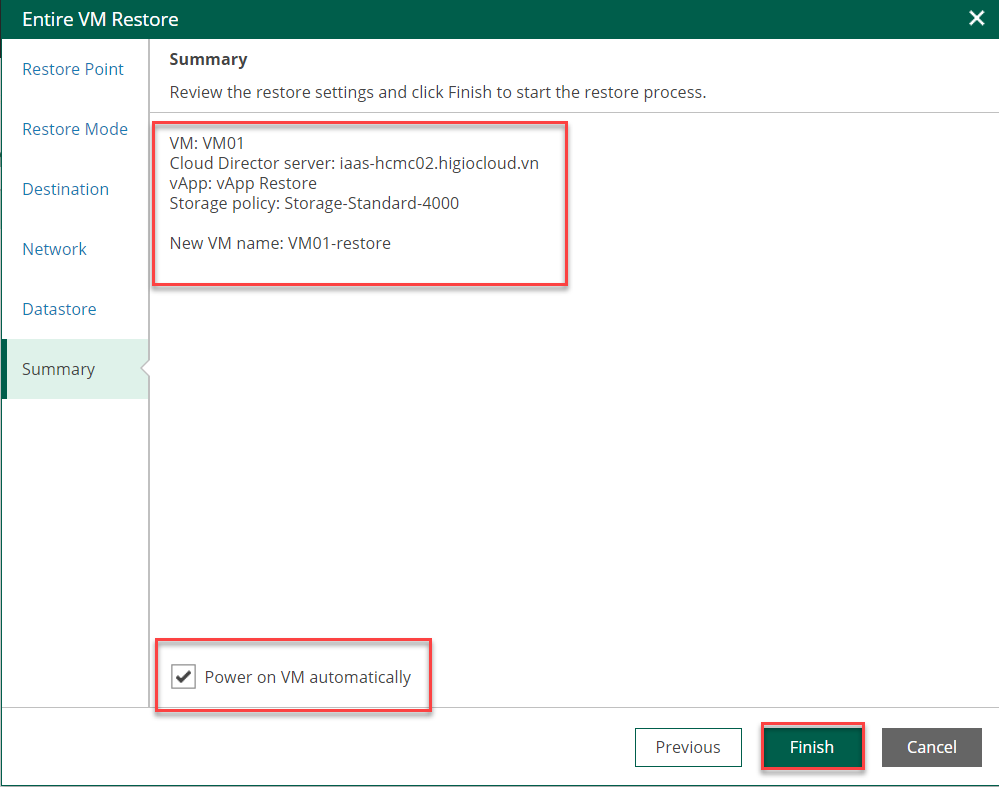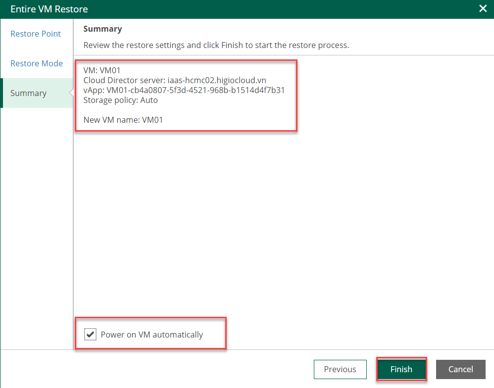 Verify thông tin khôi phục VM → Chọn Power on VM automatically → Finish.