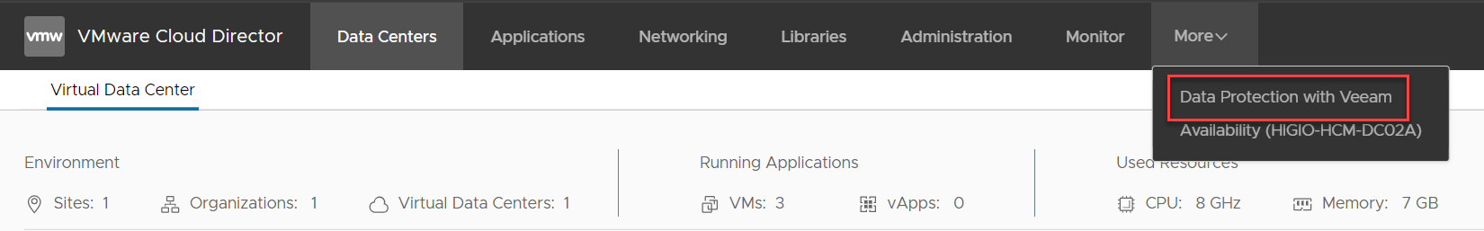 Bước 1: Từ menu chính của cổng vCD, chọn More → Data Protection with Veeam.