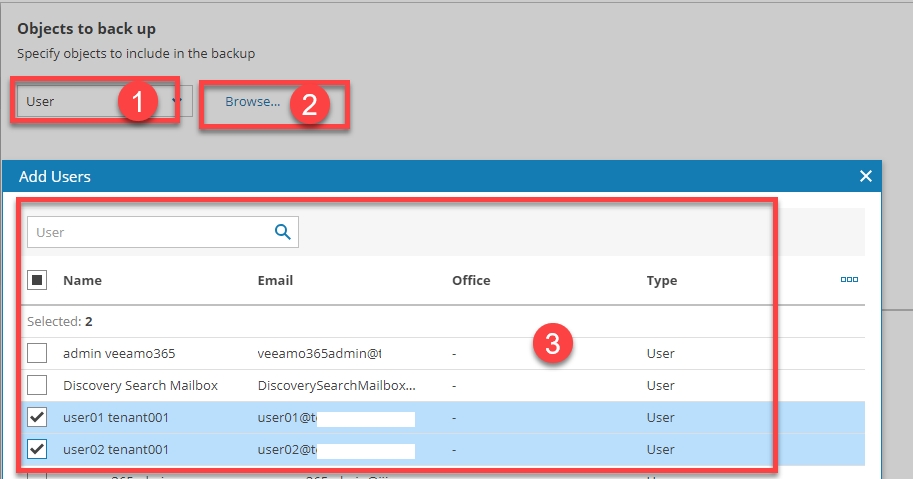 Trong cửa sổ Objects to Back up, chọn loại đối tượng cần backup: User, Group, Site, Teams, Personal Sites, hoặc Current organization.