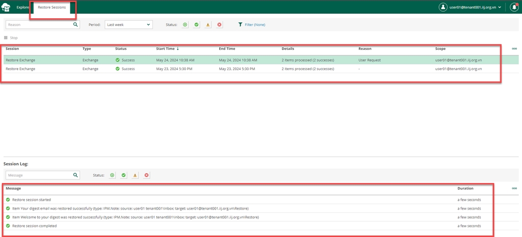 Restore Portal sẽ thực hiện thao tác restore ngay lập tức và mở tab Restore Sessions, nơi bạn có thể xem chi tiết về tiến trình và kết quả của phiên restore.