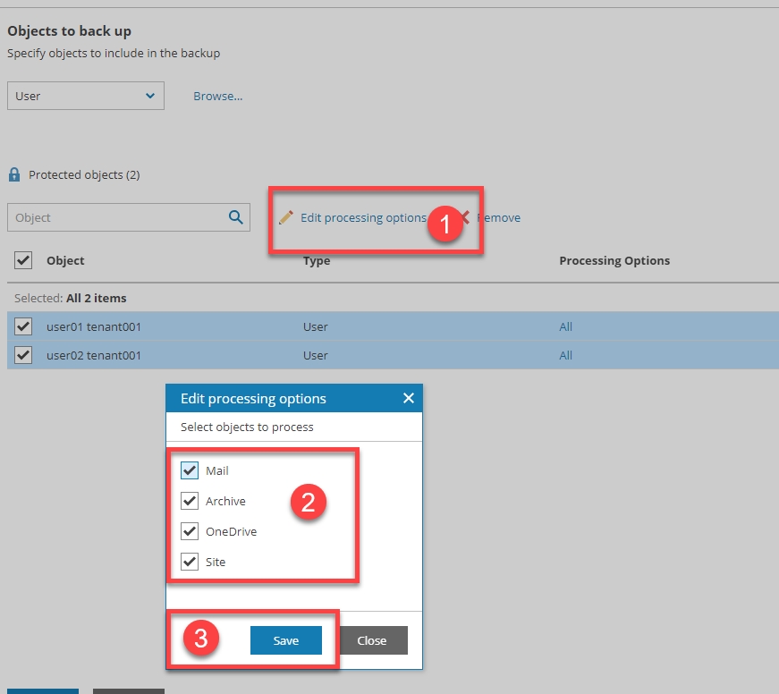 [Đối với các loại đối tượng User, Teams, Group, và Current organization] Trong cửa sổ Edit processing options, chọn các tùy chọn xử lý cần thiết và nhấn Save.