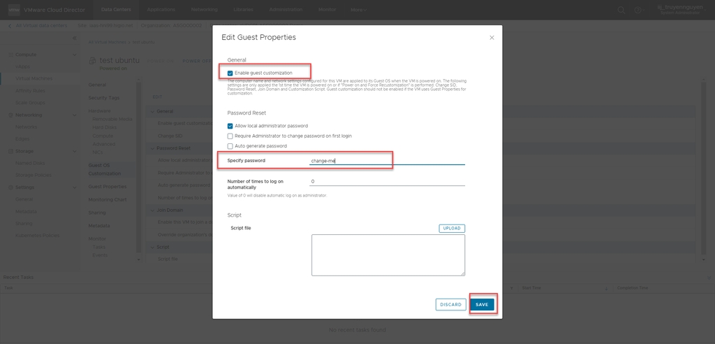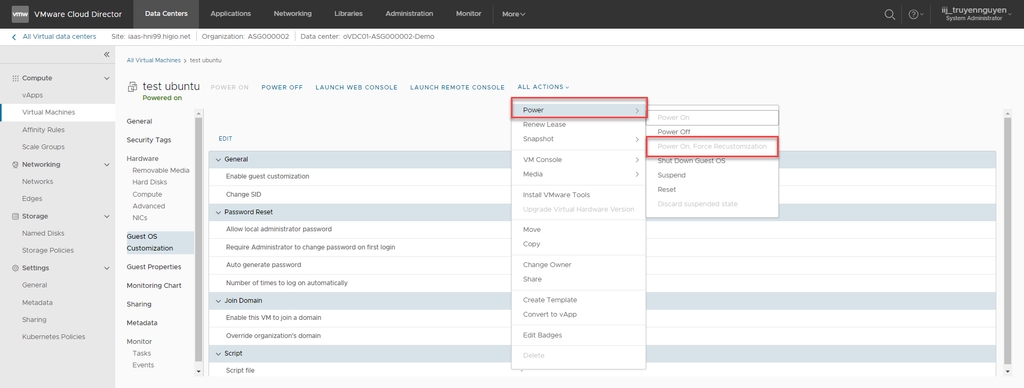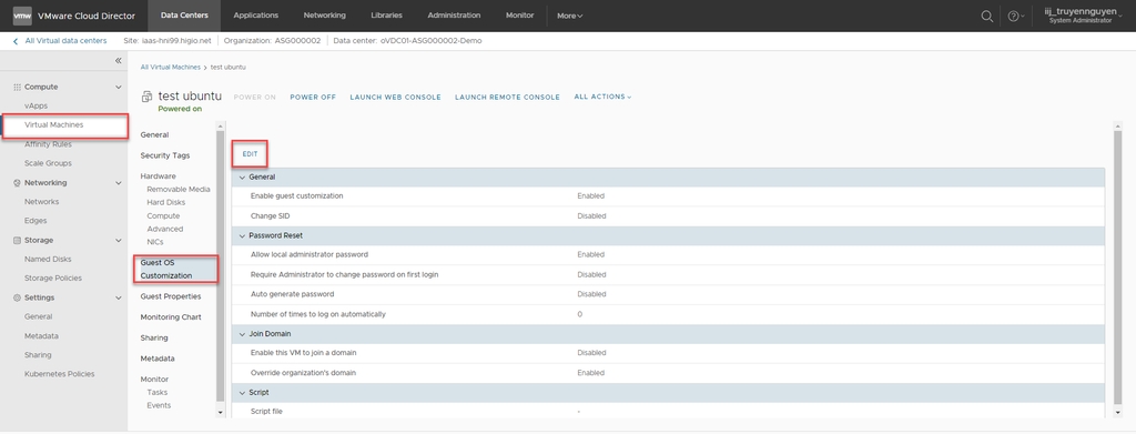 Bước 1: Đăng nhập vào cổng vCD > Data Centers > Virtual Machines > Guest OS Customization > EDIT.