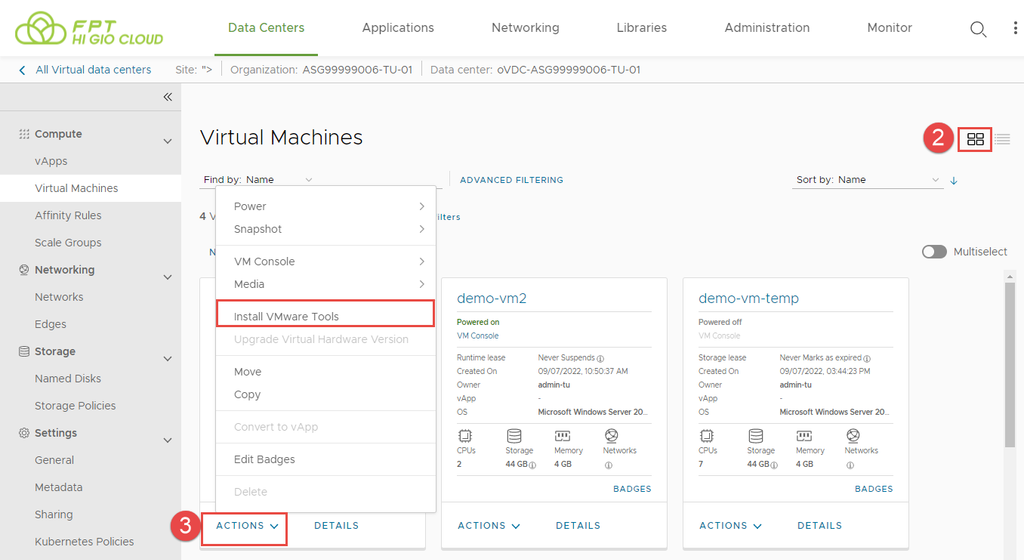 Bước 3: Trên thẻ của máy ảo mà bạn muốn khởi động, nhấp vào ACTIONS > Install VMware Tools. Nhấp vào Install trong hộp thoại bật lên.