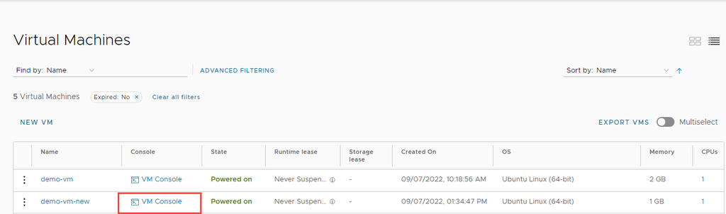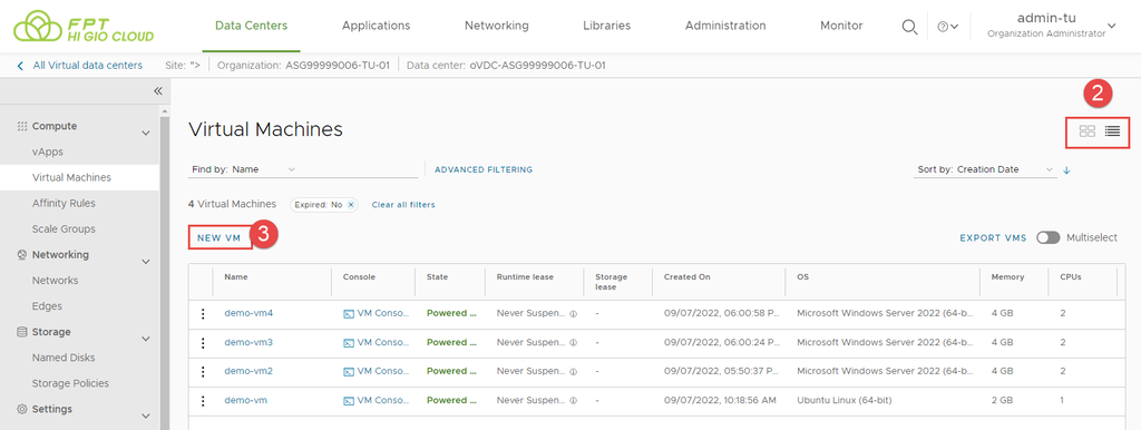 **Bước 1**: Trên màn hình bảng điều khiển **Virtual Data Center**, nhấp vào thẻ của trung tâm dữ liệu (TTDL) ảo mà bạn muốn truy cập, và từ bảng bên trái, chọn **Virtual Machines**.