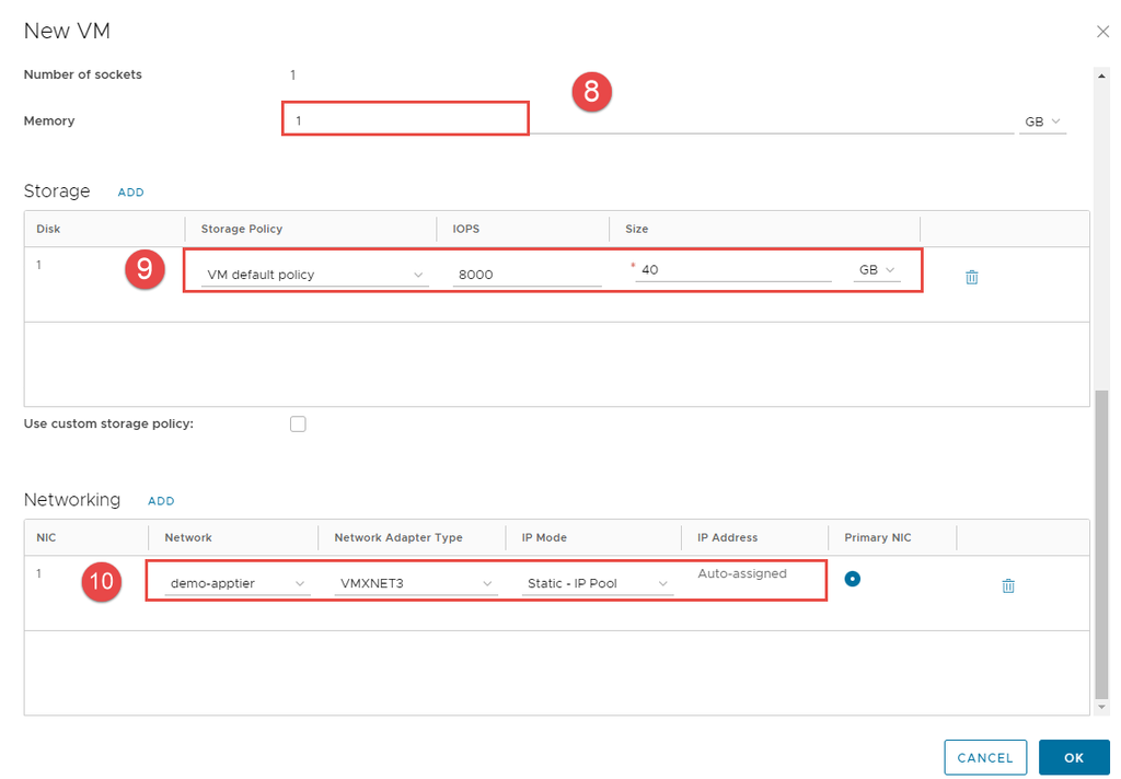 **Bước 9**: **Storage**: Chọn **Storage Policy** và kích thước ổ đĩa.