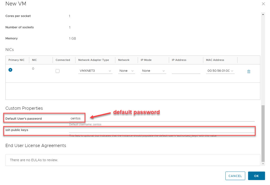 Lưu ý: Nếu sử dụng template Linux, bạn có thể thay đổi mật khẩu mặc định hoặc khóa SSH public (optional)