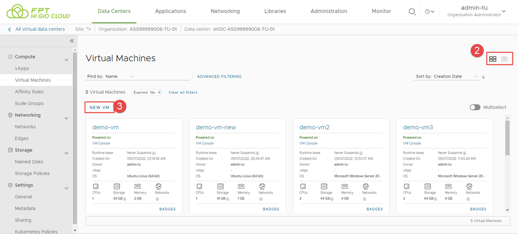 Bước 1: Trên màn hình bảng điều khiển Virtual Data Center, nhấp vào thẻ của trung tâm dữ liệu ảo mà bạn muốn truy cập, và từ bảng bên trái, chọn Virtual Machines.