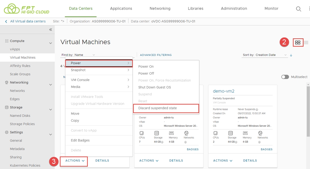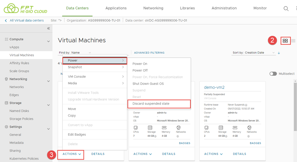 Bước 3: Trong thẻ của máy ảo mà bạn muốn bắt đầu, nhấp vào ACTIONS > Power > Discard the suspended state.