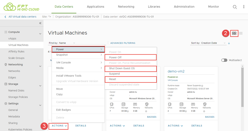 Bước 3: Trong thẻ của máy ảo mà bạn muốn tắt nguồn, nhấp vào ACTIONS > Power > Power Off/Shut Down Guest OS/Reset.