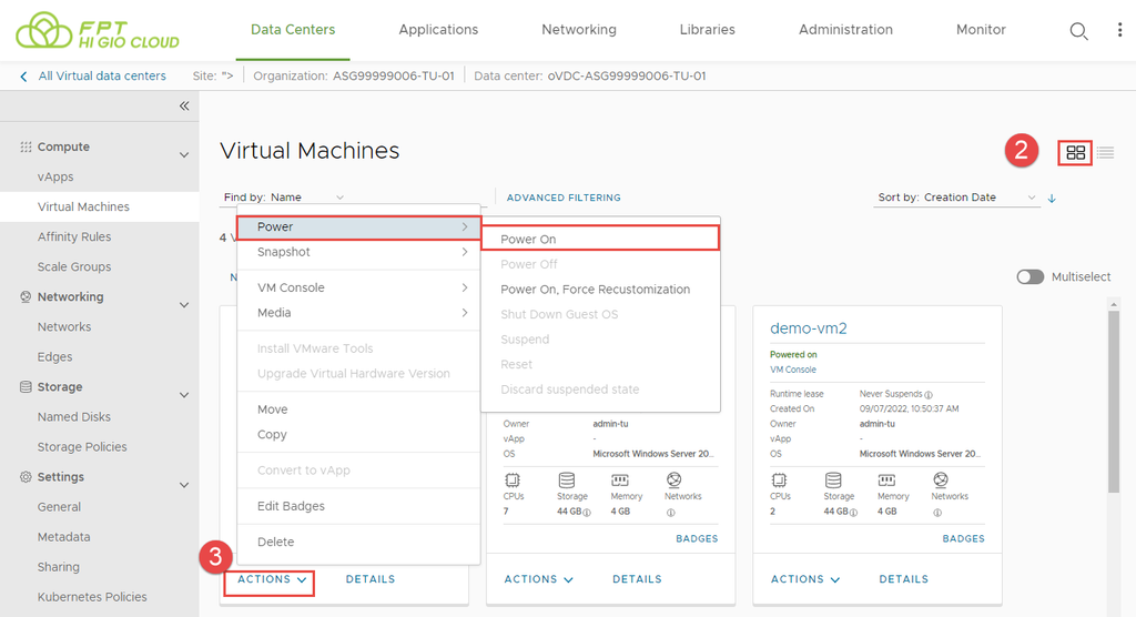 Bước 3: Trên thẻ của máy ảo mà bạn muốn khởi động, nhấp vào ACTIONS > Power > Power On.