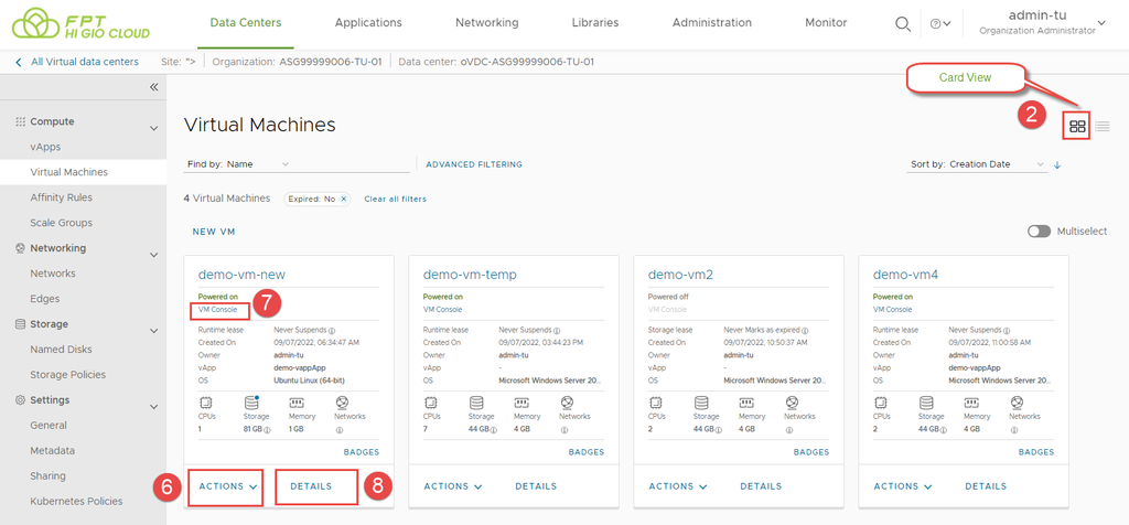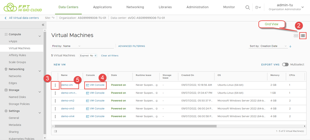 Bước 1: Trên màn hình bảng điều khiển Virtual Data Center, nhấp vào thẻ của trung tâm dữ liệu ảo mà bạn muốn truy cập, và từ bảng bên trái, chọn Virtual Machines.