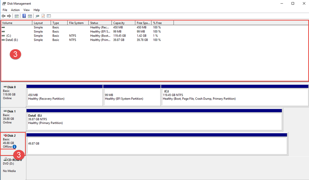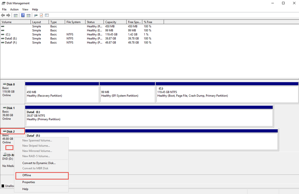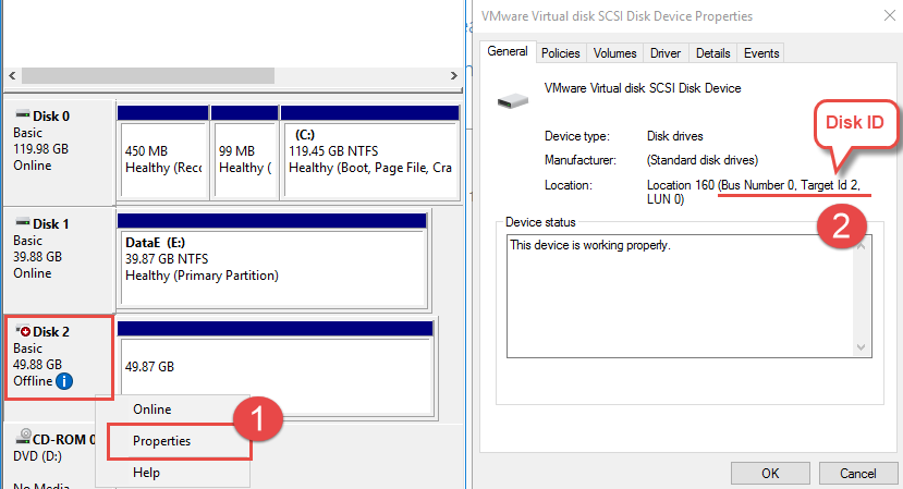 * Xác nhận trạng thái ổ đĩa = offline trong Windows OS và cung cấp thông tin ổ đĩa cho đội hỗ trợ (họ sẽ hỗ trợ phần hạ tầng).&#x20;