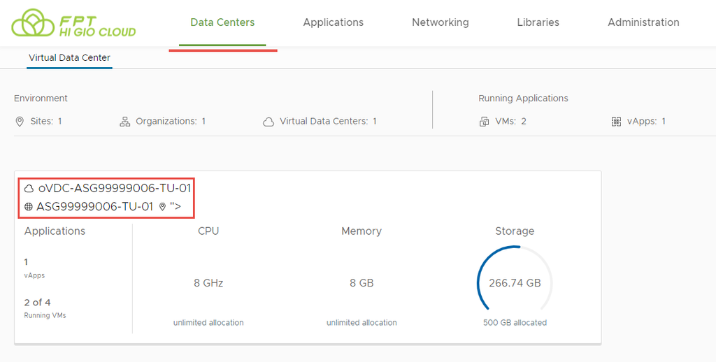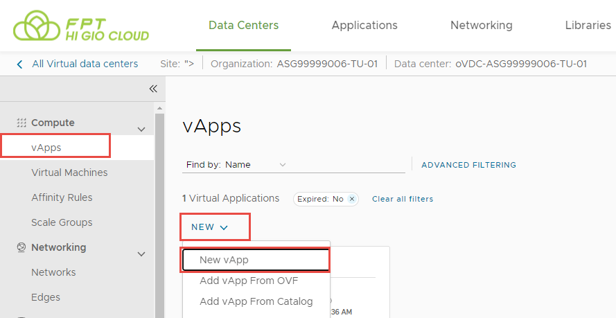 Bước 1: Trên màn hình bảng điều khiển Virtual Data Center, nhấp vào thẻ của trung tâm dữ liệu ảo bạn muốn khám phá, và từ bảng điều khiển bên trái, chọn vApps.