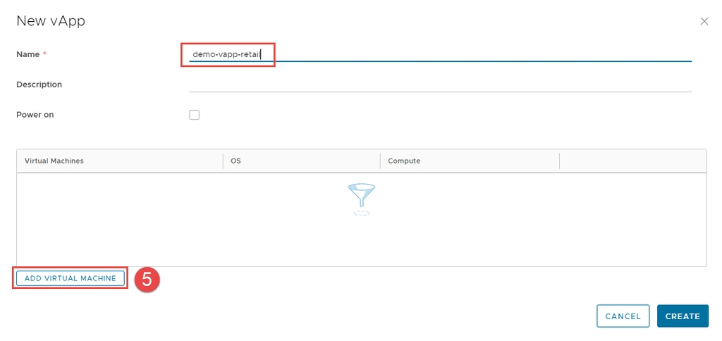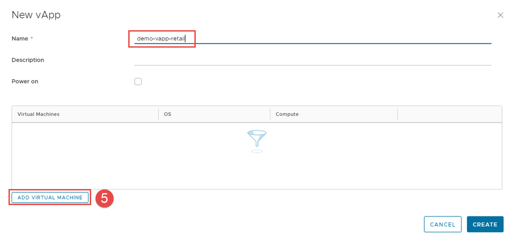 Việc xây dựng vApp yêu cầu bạn cung cấp tên và, tùy chọn, mô tả của vApp. Bạn có thể quay lại và thêm các máy ảo vào vApp sau.
