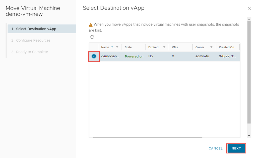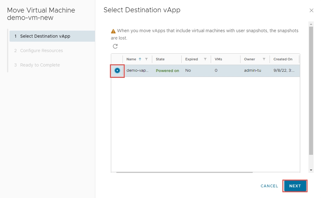 Bước 4: Chọn Destination vApp, sau đó nhấp vào Next.