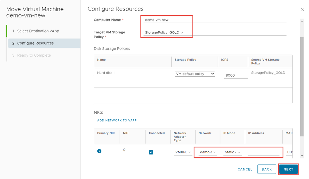 Nhập và xác nhận thông tin: Name, Computer Name, Target VM storage Policy, Network, IP Mode cho máy ảo, sau đó nhấp vào Next.