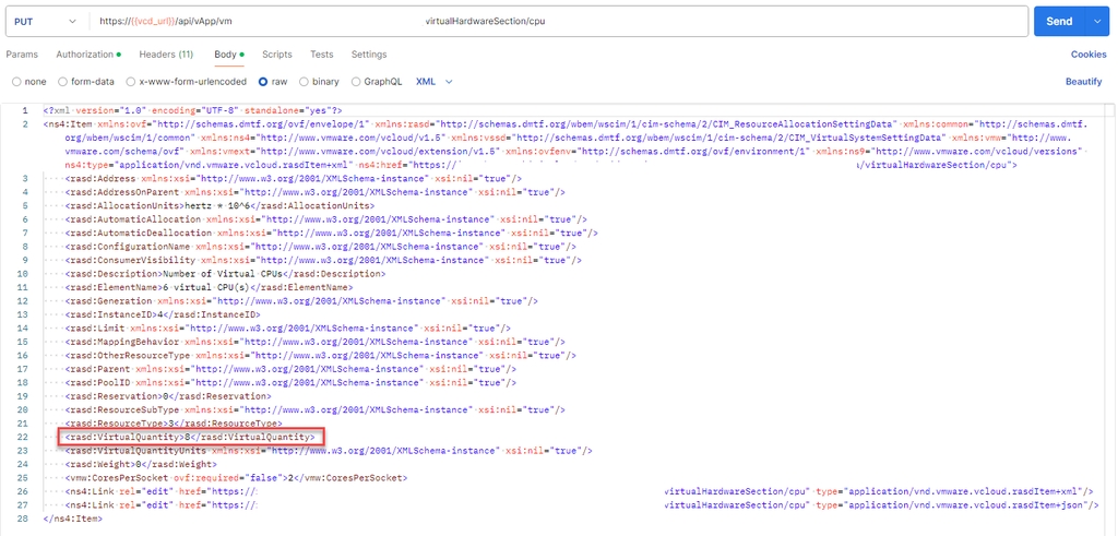 PUT https://{{vcd_url}}/api/vApp/{{vm-uuid}}/virtualHardwareSection/cpu