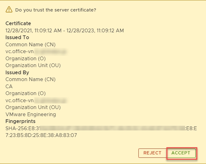 - Chọn Next và ACCEPT chứng chỉ SSL của vCenter Server Lookup để tiếp tục.