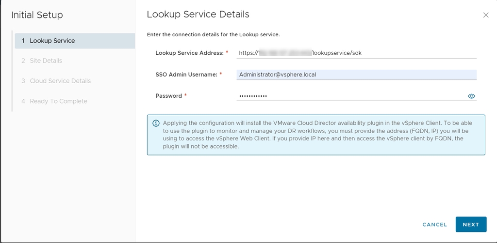 - Lookup Service. Nhập chi tiết kết nối để cấu hình lookup service cùng với thông tin đăng nhập SSO admin: - Lookup service address. Nhập URL sau, thay thế "Ip-of-your-vcenter" bằng địa chỉ IP của vCenter của bạn: - https://Ip-of-your-vcenter:443/lookupservice/sdk