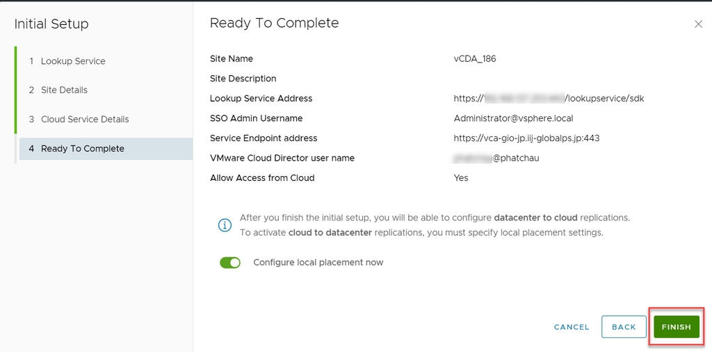 - Move on to Ready to Complete. Tiến hành xem lại các chi tiết bạn đã cung cấp trong các bước trước. Kiểm tra lại xem tất cả thông tin có chính xác không. - Kích hoạt Configure local placement now để kích hoạt việc replication từ cloud đến datacenter. Nếu không chọn ô này, bạn sẽ cần thiết lập thêm để cấu hình các replication.