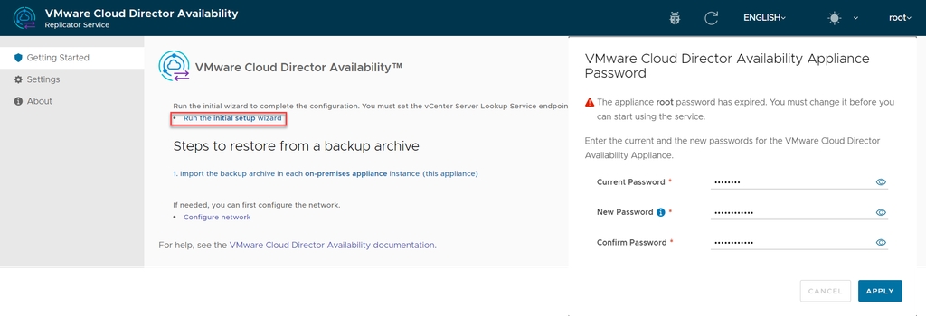 - Truy cập vào appliance vCDA của bạn tại https://your-appliance-IP/ui/admin. Sử dụng root/password đã được định nghĩa trong quá trình triển khai OVA.