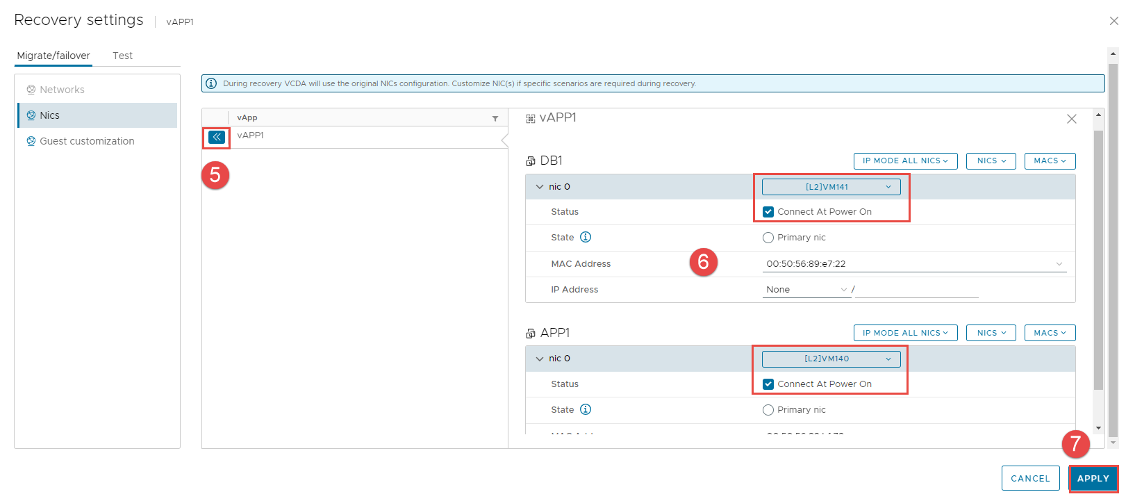 **Bước 3:** Trong cửa sổ Recovery settings > nhấn vào tab **Nics** > **vAPP1**.