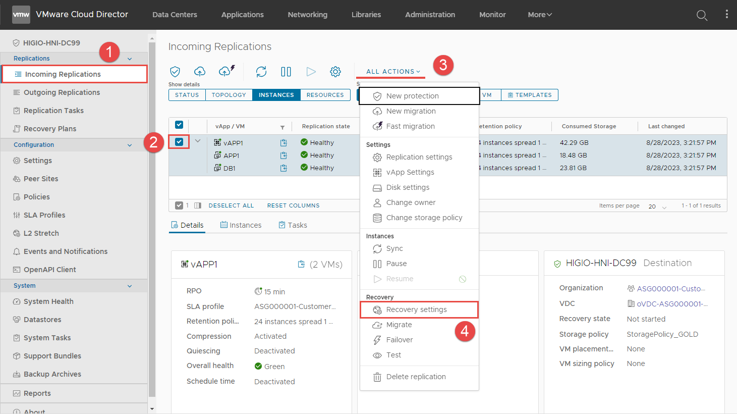 **Bước 2:** Chọn Incoming Replications > **chọn vAPP1 > ALL ACTIONS > Recovery settings**.