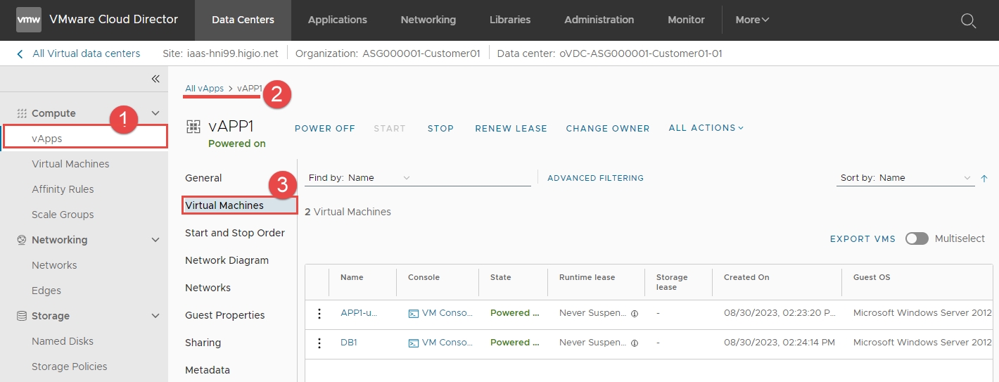 Bước 1: Đăng nhập vào HI GIO portal: chọn vAPP1 > Virtual machines.