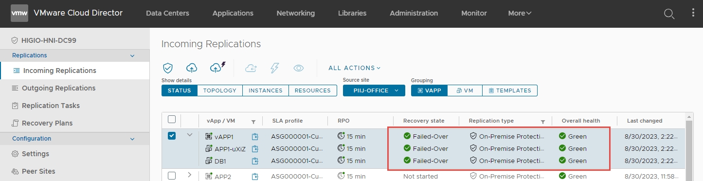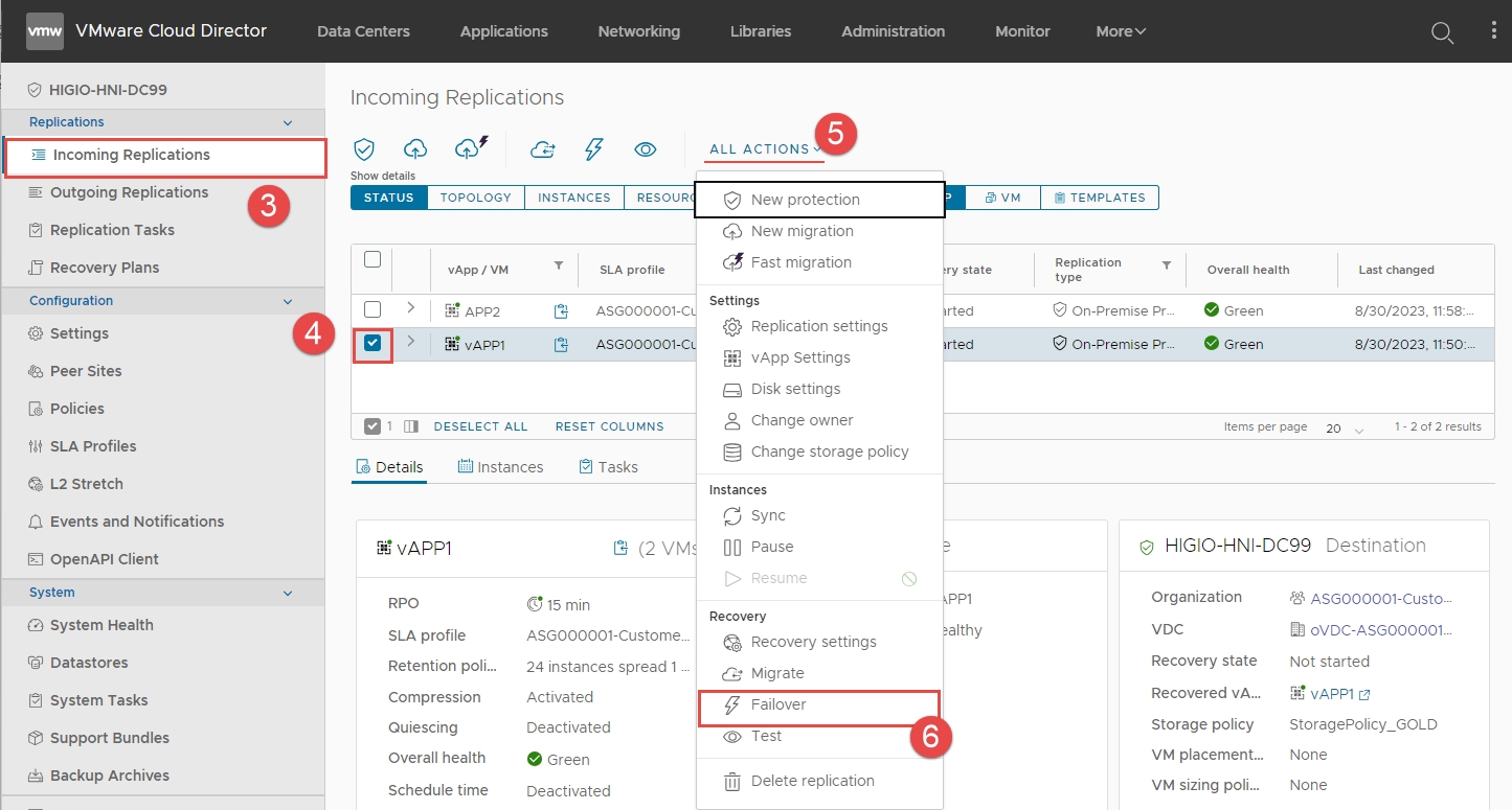 Bước 3: Nhấn vào Incoming Replications > Tích chọn checkbox cho VM APP1 > Mở rộng ALL ACTIONS > Nhấn vào Failover.