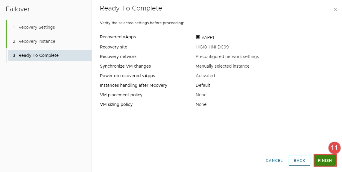 - Power Settings: Power on recovered vApps.