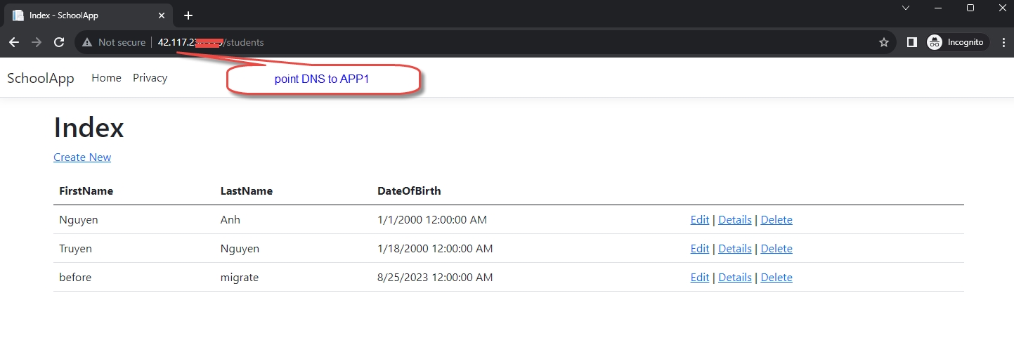 Bước 4: Chỉ định tên miền tới APP1 (cập nhật bản ghi DNS công cộng nếu cần).
