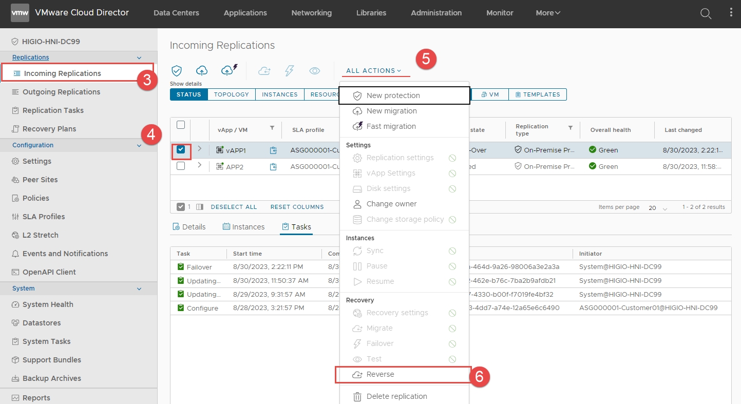 Bước 3: Nhấn vào Incoming Replications > Tích chọn checkbox cho vAPP1 > Mở rộng ALL ACTIONS > Nhấn vào Reverse.