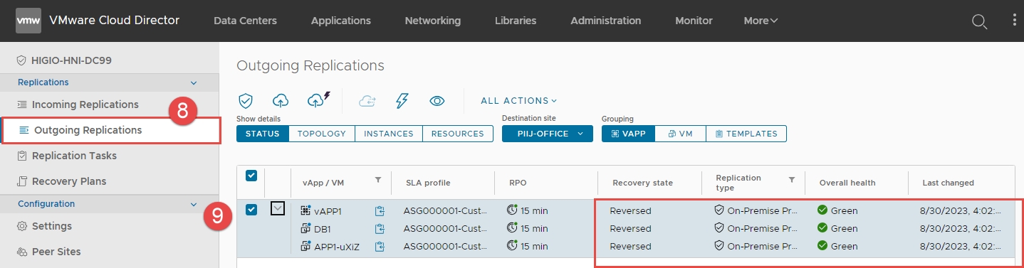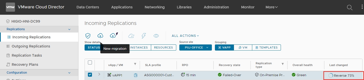 Reverse Replication is in progress. Bạn có thể theo dõi tiến trình của tác vụ đảo ngược trong phần Last changed và trạng thái replication.
