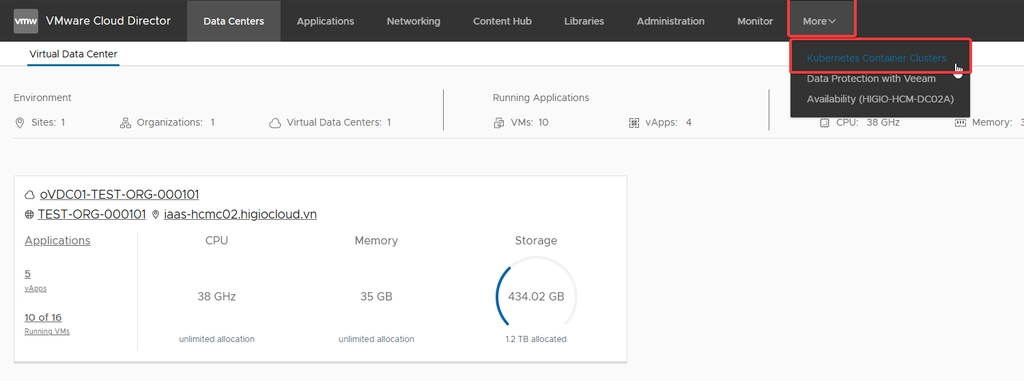 Bước 1: Từ vCD portal, chọn More → Kubernetes Container Clusters.